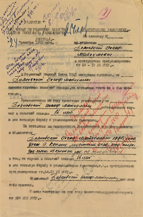 На тому ж допиті Юзеф Бояновський визнав себе винним у тому, що служив у польській поліції та «вів боротьбу з революційним рухом робітничого класу і селянства».