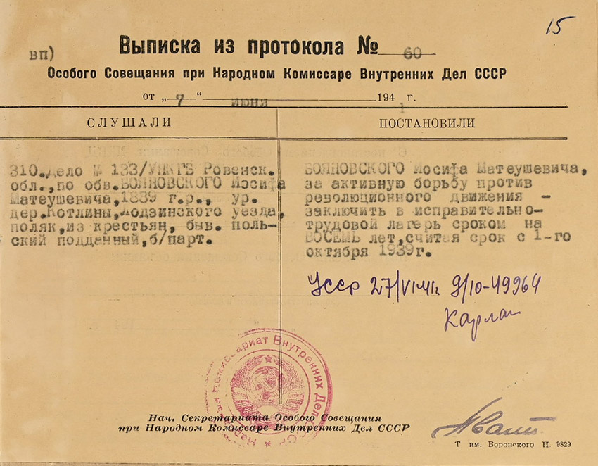 Постановою Особливої наради від 7 червня 1941 р. «за активну боротьбу проти революційного руху» Юзефа Бояновського засуджено на вісім років виправно-трудових таборів. Термін покарання він відбував у «Карлазі».