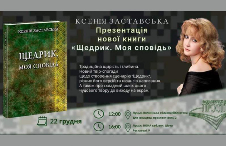 Ксенія Заставська – українська письменниця і сценаристка фільмів «Щедрик», «Актриса», «Стеф», «БожеВільні» та «Відьмак». 22 грудня вона представить у Луцьку книгу «Щедрик. Моя сповідь».