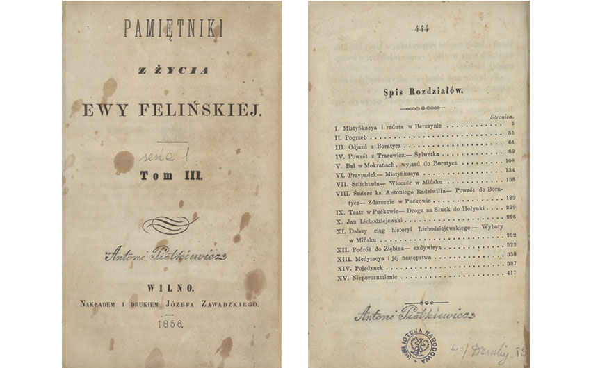 Титульна сторінка і зміст ІІІ тому першого видання «Мемуарів життя Еви Фелінської», Вільнюс, 1856 р.