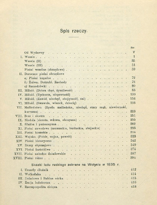 «Том містить три описи весілля, обрядові весільні й календарні пісні (загалом 148), пісні та мелодії на загальну тематику, а також 25 казок, записаних приблизно в 1835 р. Яном Прусіновським і переданих ним Кольбергові», – читаємо на інтернет-сторінці Інституту імені Оскара Кольберга.
