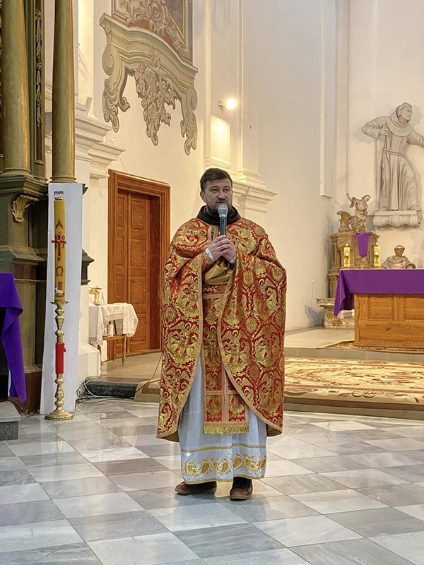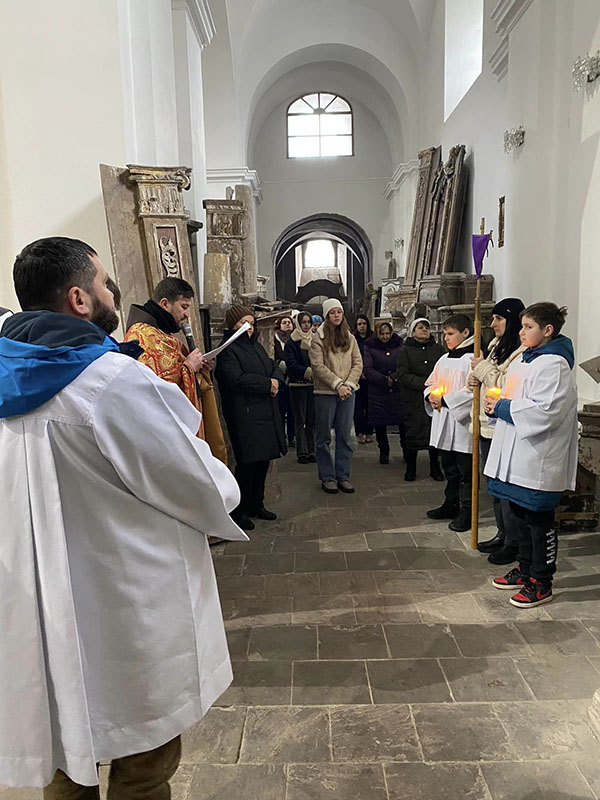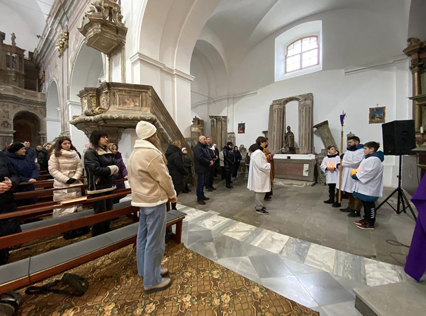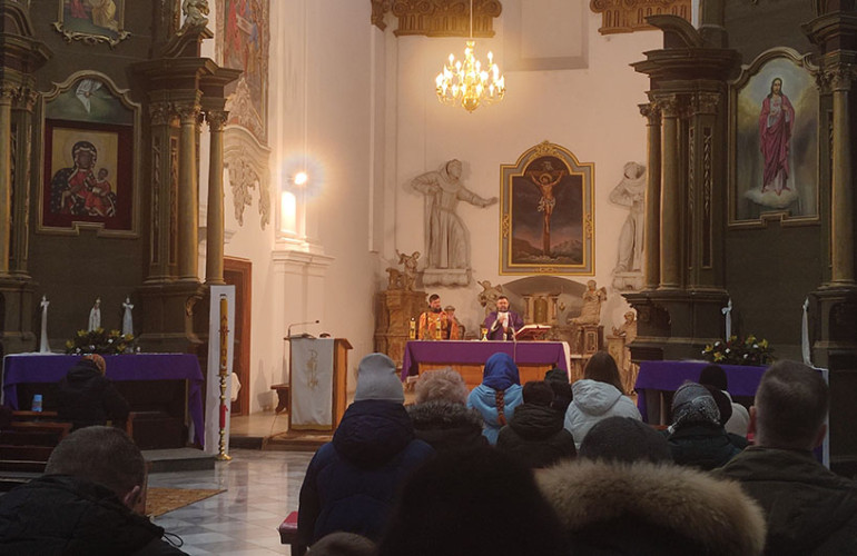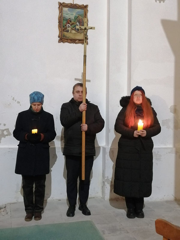 Під час цього молебню прихожани згадували трагічні події, які відбувалися дві тисячі років тому, та ті, які розпочалися два роки тому в нашій державі. Згадували багато міст України, які зазнали страхіть від агресора. Молилися за мирне небо. Серед слів роздумів Хресної дороги були наступні: «Багато країн Європи і світу не думали, що доведеться нести чужий хрест. Вони відкрили серце й подали руку. Однією з перших була Польща. Нехай Господь благословить Польщу, поляків та цілий світ».