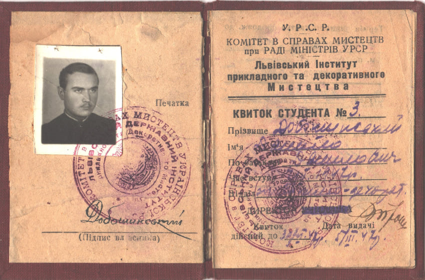 Дядько вступив у Львівське училище прикладного мистецтва. Збереглися перші знімки його як студента училища та інституту, замальовки 1947 р. із гуртожитка, рисунки. На них «увіковічено», зокрема, ще зовсім юних художників Софію Караффу-Корбут та Івана Катрушенка. Потім він вступив на другий курс Львівського державного інституту прикладного і декоративного мистецтва (ЛДІПДМ, нині Львівська національна академія мистецтв), який закінчив у 1953 р. У ньому ж залишився працювати.