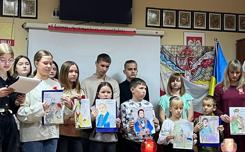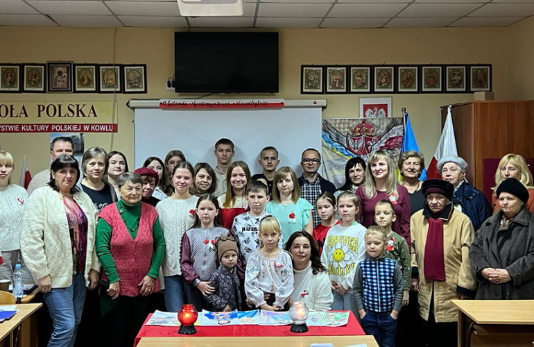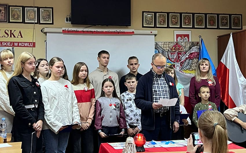 У класі польської школи в цей день панувала урочиста атмосфера. Тут були прапори, фотографії видатних діячів та біло-червоні лампадки.