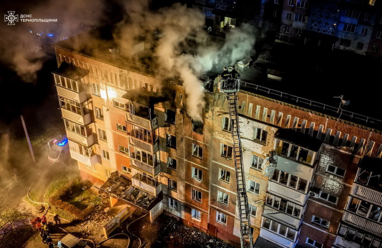 «Уночі внаслідок удару ворожого дрона в Тернополі постраждав багатоквартирний будинок, що спричинило масштабну пожежу. Загинула одна людина, троє отримали поранення (згодом повідомили про четверту поранену особу, – ред.). Вибуховою хвилею пошкоджено вікна сусідніх будівель, школи та 20 авто», – повідомила ДСНС України.