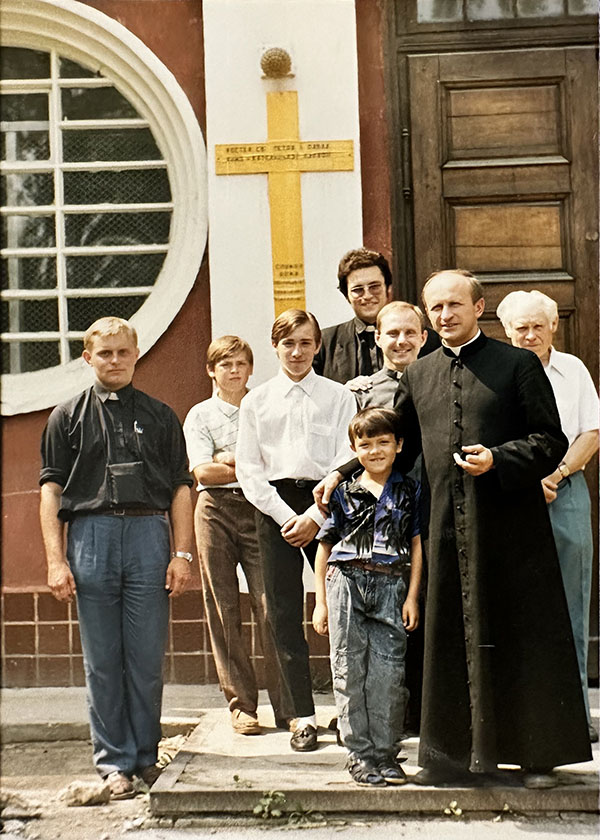 Отець Владислав Чайка, Мирослав Лукомський за ним, Павло та Віталій Машлаї, отець Вітольд-Йосиф Ковалів. Початок 1990-х.