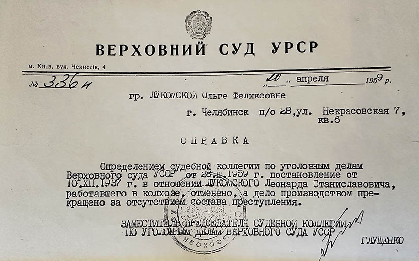 Леонарда Лукомського стратили як ворога народу. Людмила Машлай зауважує: «За три дні після арешту його розстріляли в Ізяславі. Сестра батька згодом писала листи й отримала в 1959 р. відповідь від Верховного суду УРСР. Дідусь безвинно загинув». «Постанову відносно Лукомського Леонарда Станіславовича, який працював у колгоспі, скасовано, а справу припинено у зв’язку з відсутністю складу злочину», – йдеться в документі Верховного суду УРСР.