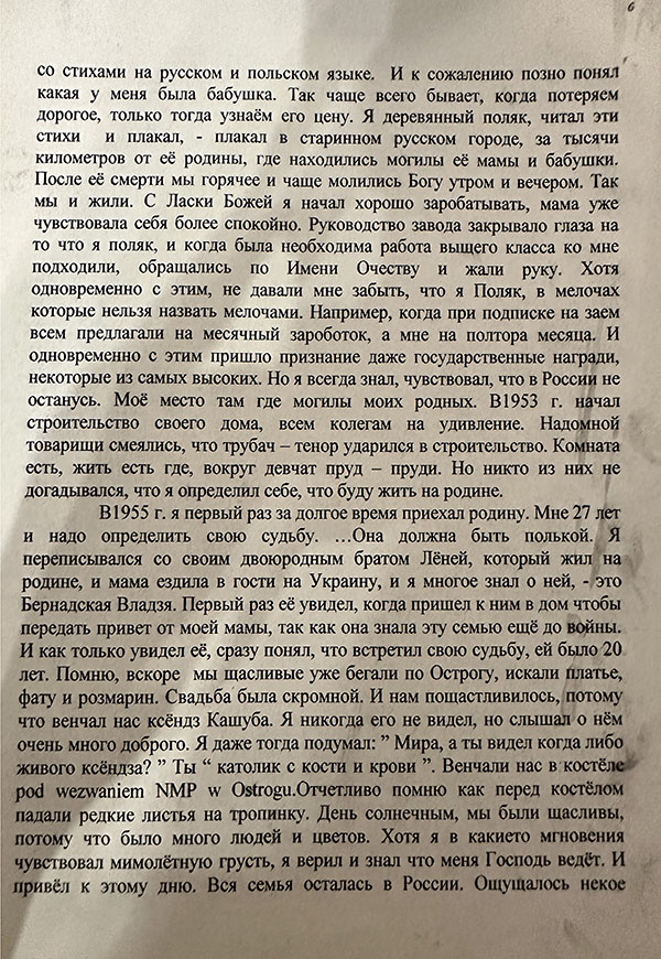 «Моя рідня – з Кам’янки. Батько Станіслав Францович Бернацький (1905–1964 рр.) мав трьох сестер. У мами Галини Станіславівни (1908–1987 рр.) – чотири сестри і чотири брати. Загалом їх було 14, але інші діти померли маленькими. Родину радянська влада виселила в Казахстан у 1936 р. Мама залишилася, бо на той час уже жила окремо й мала двох дітей. Вони жили добре. Дідусь був господарем. Як мама розповідала, мав пару коней і велике господарство. Тоді дуже багато людей вислали», – говорить Валентина Лукомська.