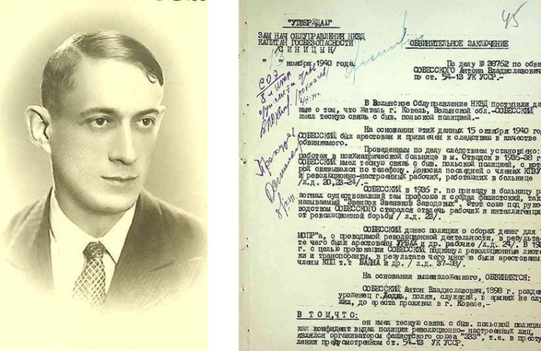 З анкети арештованого й протоколу першого допиту від 15 жовтня 1940 р. дізнаємося, що Антоній Владиславович Собеський народився в 1898 р. у Лодзі. За фахом – бухгалтер. Протягом останнього часу був безробітним, тому закінчив радіо-телеграфічні курси при ковельському радіовузлі. На момент арешту проживав у Ковелі разом із дружиною Монікою, 36 років, домогосподаркою, сином Георгієм, 18 років, чорноробочим ковельського залізничного вузла, й дочкою Юліаною, 10 років, ученицею школи. Разом із ними проживав брат Станіслав Собеський, 1890 р. н. Як зафіксовано в документах, до революції Антоній Собеський двічі перебував під наглядом поліції за підозрою в розкраданні коштів, проте його вину не довели. В армії, за словами затриманого, він не служив за станом здоров’я.