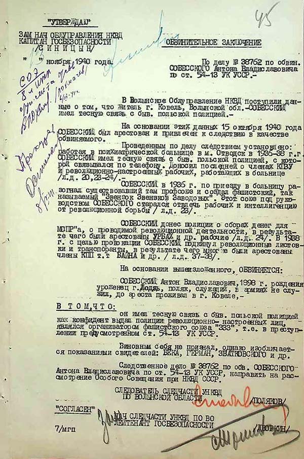 Енкаведистів цікавила робота Антонія Собеського в «Зофіювці». Вони звинуватили його в розпуску профспілки, якою керували діячі Комуністичної партії Польщі, та створенні, як записано у протоколі, «фашистської профспілки ЗЗЗ – Звьонзку звьонзків заводових» (центральний профспілковий орган у Польщі в 1931–1939 рр., – ред.), але Собеський усе заперечив. Також слідчі виявили, що арештований особисто знав і кілька разів зустрічався з Булою – комісаром поліції в Отвоцьку. Собеський продовжував заперечувати, що був конфідентом поліції.