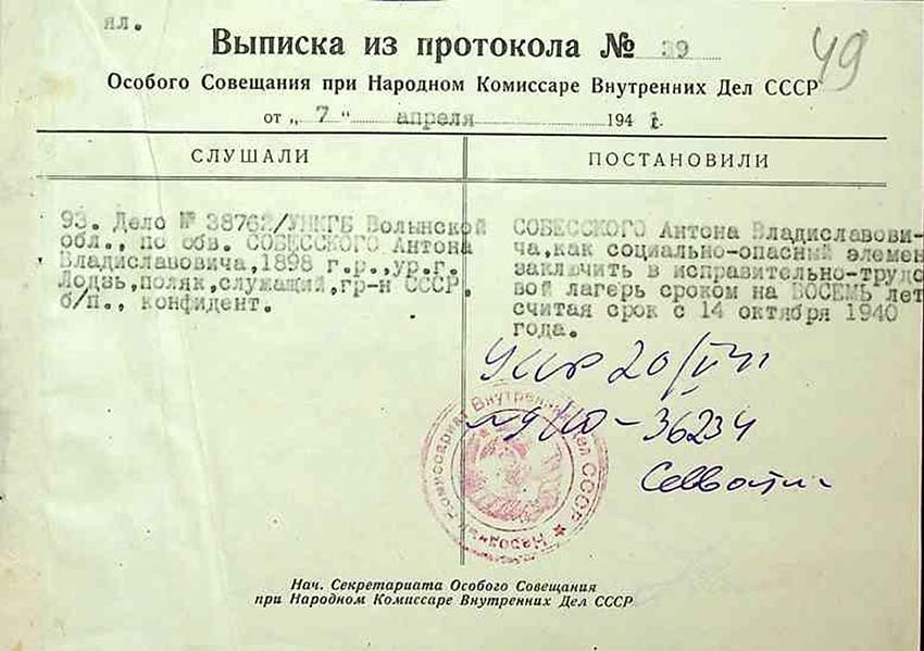Згідно з протоколом № 39 від 7 квітня 1941 р., Антонія Собеського помістили у виправно-трудовий табір строком на вісім років, відраховуючи термін від 14 жовтня 1940 р. Покарання він відбував у Севвостлазі. Його подальша доля нам не відома.