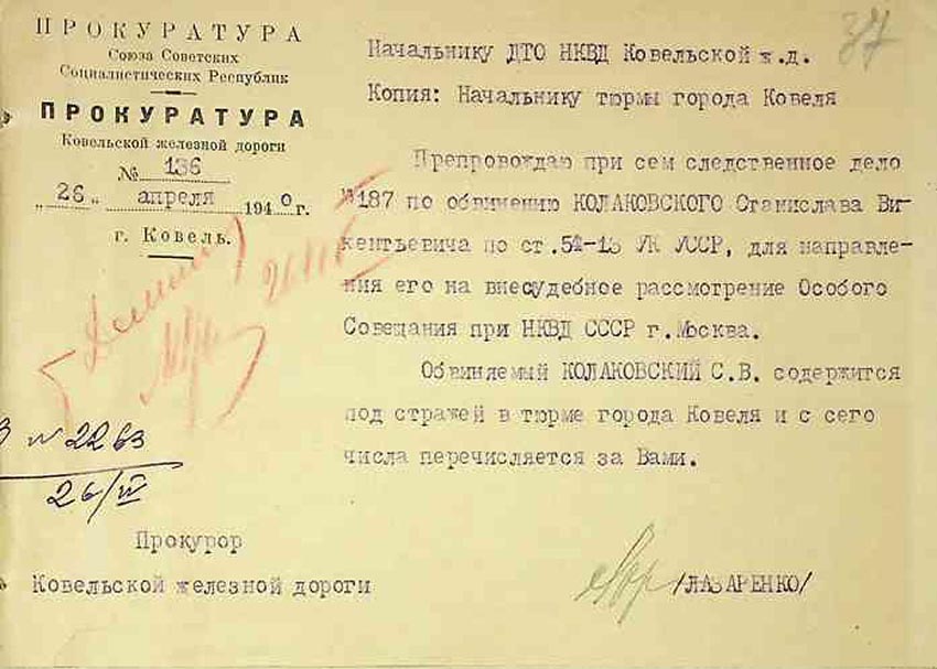 Згідно з випискою із протоколу № 142 від 25 жовтня 1940 р., Станіслава Колаковського помістили у виправно-трудовий табір строком на вісім років, відраховуючи термін від 7 лютого 1940 р.