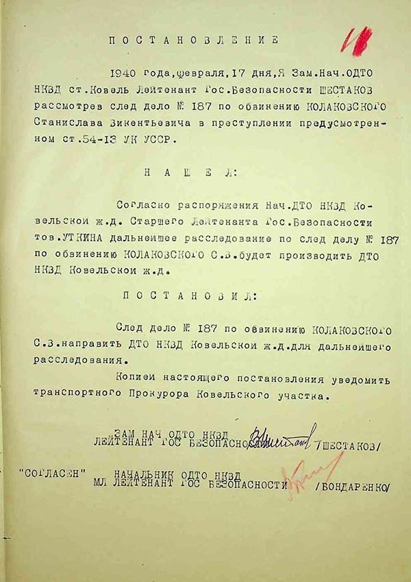 Постанова про розслідування справи Колаковського ДТО НКВД Ковельської залізниці