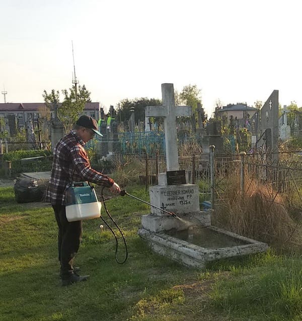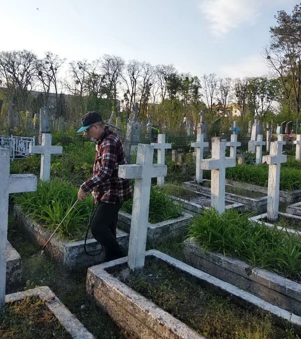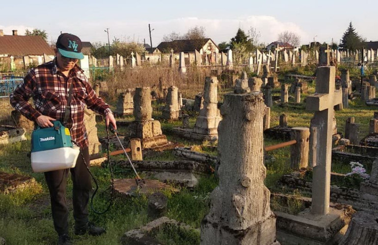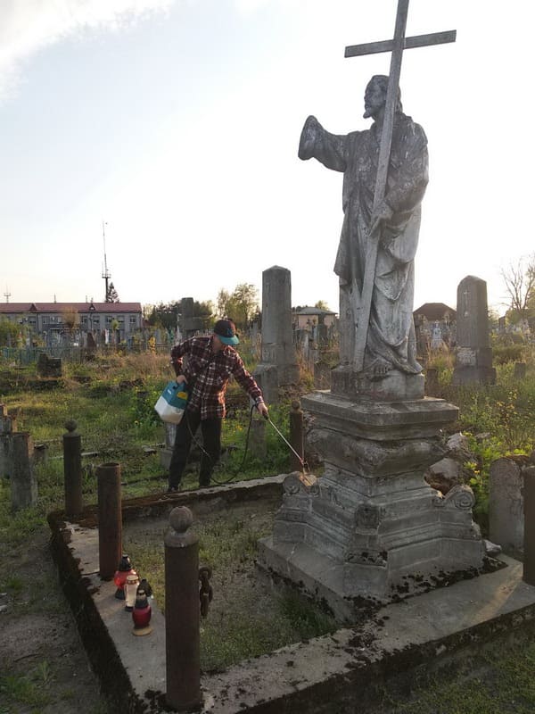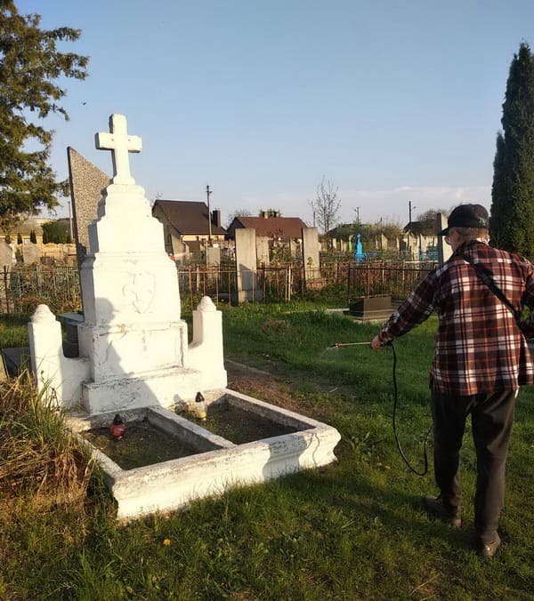 На цвинтарі в Ковелі вони обприскали бур’яни хімікатами. Це допоможе ефективніше впорядкувати всіх могили поляків, які спочивають тут протягом багатьох років.