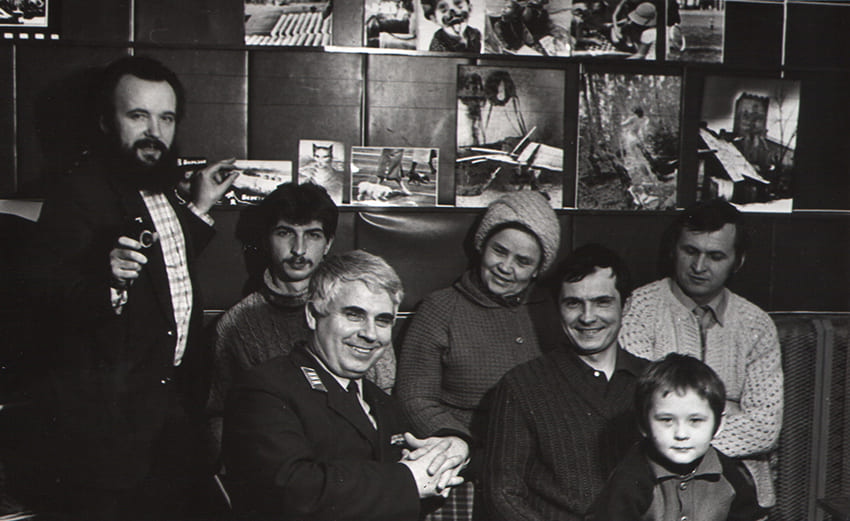 Павло Пастушенко (крайній зліва) в кіноклубі. В центрі – Ірина Левчанівська, зліва від неї – Євгеній Боярчук. Луцьк, 1984 р.
