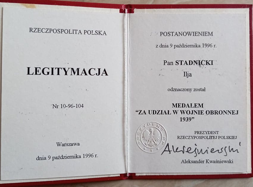 Наприклад, президент Польщі Александер Квасневський відзначив Іллю Стадницького медаллю «За участь в оборонній війні 1939 р.» у 1996 р., тобто ще за його життя. А ось лист із Генерального консульства Республіки Польща у Львові з повідомленням про призначення йому постійної грошової допомоги як ветерану Війська Польського родині надійшов у день його смерті, тобто він так і не встиг її жодного разу отримати.