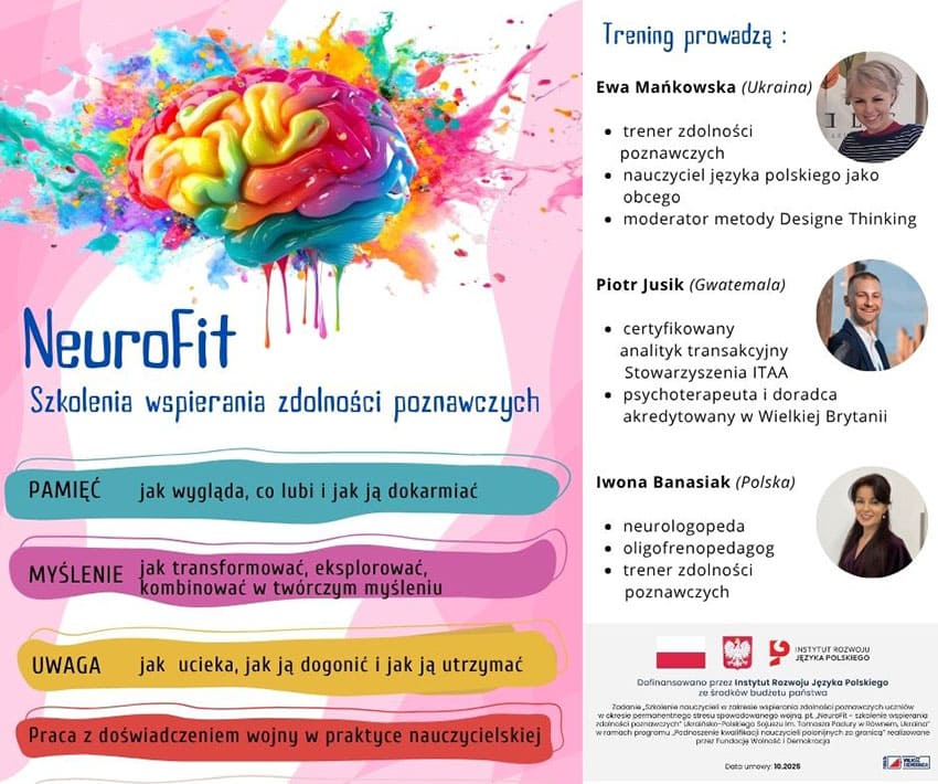Тренінги відбудуться за фінансової підтримки Інституту розвитку польської мови за кошти державного бюджету Польщі. Проєкт «Тренінг для вчителів із розвитку когнітивних здібностей учнів у період постійного стресу, спричиненого війною, під назвою «NeuroFit – тренінг із розвитку когнітивних здібностей» реалізує Українсько-польський союз імені Томаша Падури в Рівному в межах програми «Підвищення кваліфікації польських вчителів за кордоном», яку втілює фундація «Свобода і демократія».
