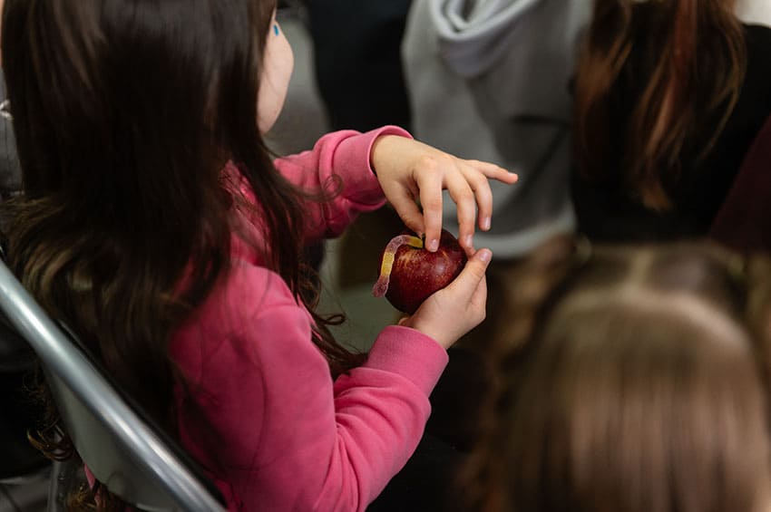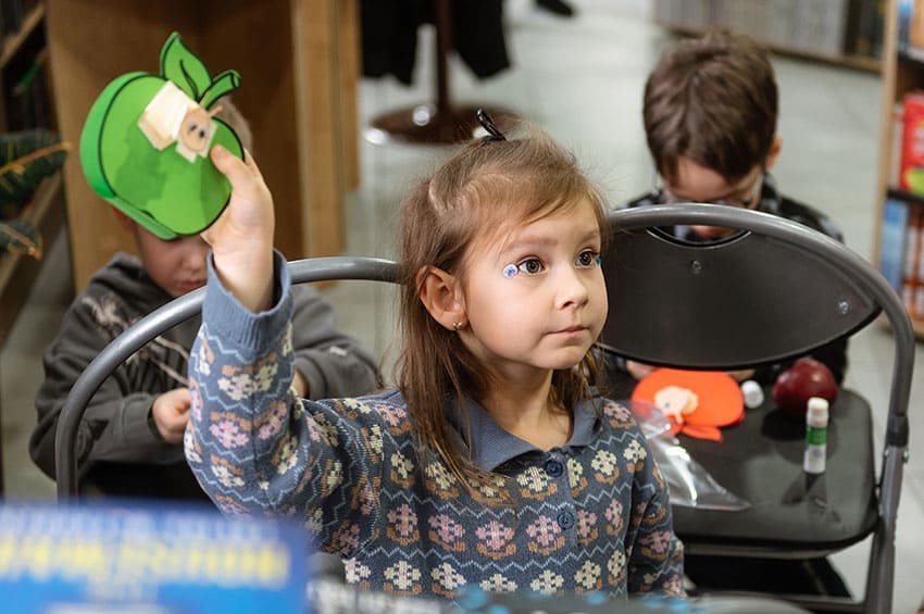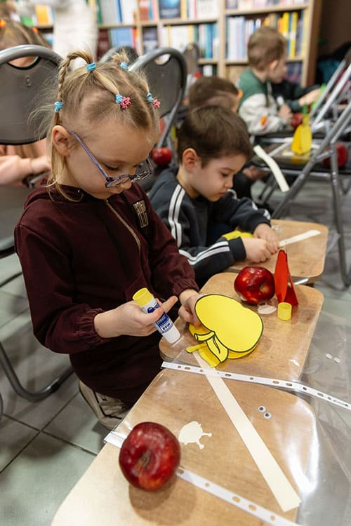 Після театралізованого читання дітлахи під керівництвом вихователів виконували інтерактивні завдання на розуміння почутого тексту та власноруч створювали поробки, які зображали героїв оповідання: яблуко та черв’яка.