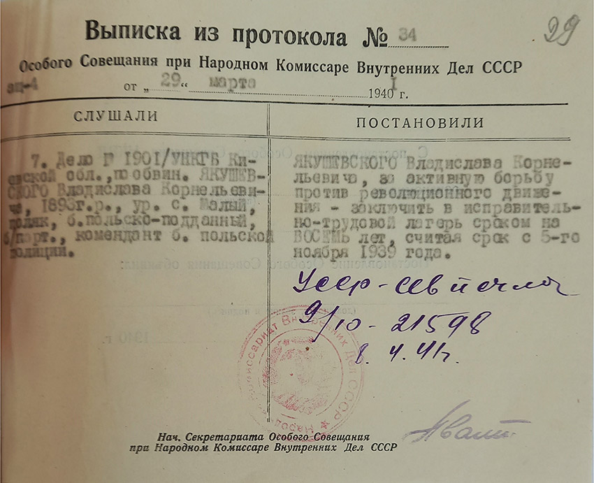 W drugiej decyzji wydanej 25 października 1940 r. przez śledczego jednostki śledczej Zarządu NKWD obwodu kijowskiego Sałę czytamy o aresztowaniu Władysława Jakuszewskiego na terenie Zachodniej Ukrainy z powodu nielegalnego przekroczenia przez niego granicy państwowej ZSRR od strony Rumunii, czyli popełnienia przestępstwa zgodnie z art. 80 KK USRR.