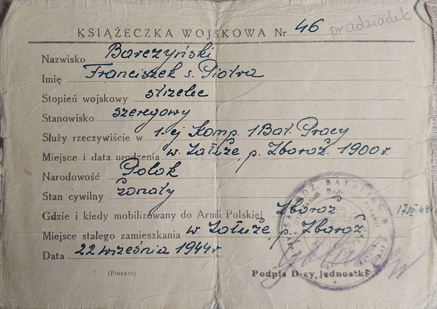 Książeczka wojskowa Franciszka Barczyńskiego, pradziadka pani Wiktorii