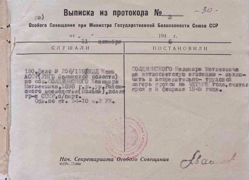 Kolejny dokument sprawy karnej, wyciąg z protokołu Kolegium Specjalnego nr 64 z dnia 1 lipca 1941 r., stwierdza, że Józef Narusz, jako element społecznie niebezpieczny, został umieszczony w poprawczym obozie pracy na okres ośmiu lat, licząc od 31 października 1939 r. Ta data świadczy, że mimo wybuchu 22 czerwca tego roku wojny niemiecko-radzieckiej, biurokratyczny mechanizm machiny represji nadal działał.