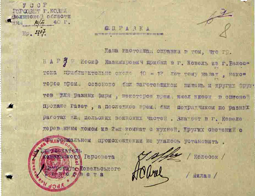 Lecz z zaświadczenia z dnia 31 stycznia 1942 r. wynika, że «decyzja Kolegium Specjalnego NKWD ZSRR z dnia 1 lipca 1941 r. w sprawie Narusza Józefa, s. Kazimierza, nie została wykonana, gdyż nie ma informacji o miejscu pobytu aresztowanego, który został ewakuowany z powodu wojennych okoliczności ze strefy przyfrontowej».