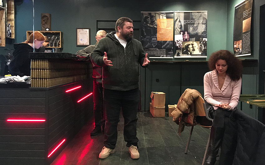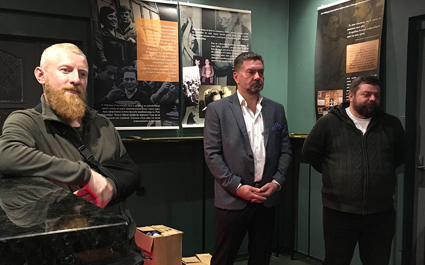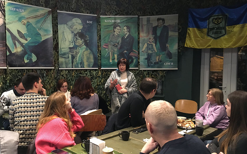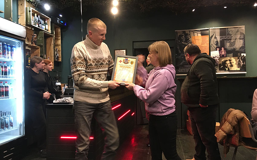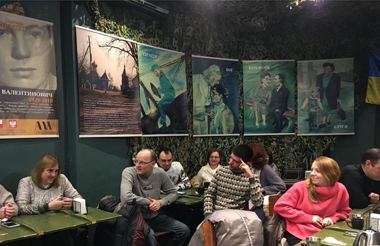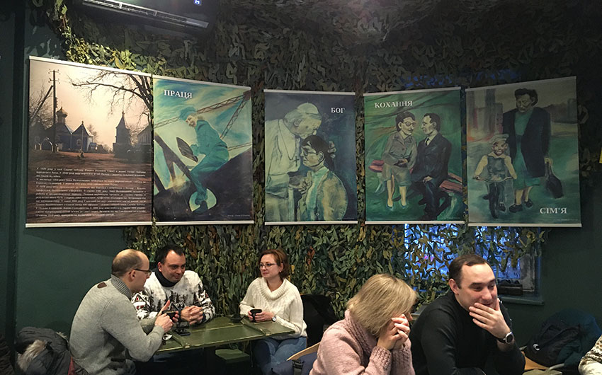 Wystawę odsłonięto w pubie «Pierwszy Wolontariacki», który został otwarty przez zespół wolontariuszy wspierających ukraińską armię. Założyciele i współwłaściciele pubu, Wasyl Capiuk i Pawło Capiuk, opowiedzieli o działalności wolontariackiej, a także o lokalu, który «powinien zarabiać i dzielić się» oraz stać się miejscem spotkań tych, którym zależy na wspieraniu armii.
