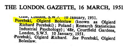 I nie doznaliśmy zawodu. W ciągu godziny jeden z członków grupy, pan K., przesłał nam fragment listy z «The London Gazette» z 16 marca 1951 r., na której Olgierd Porebski znalazł się wśród osób, którym przyznano obywatelstwo brytyjskie. Nie pomogło nam to jednak w żaden sposób udowodnić, że «brytyjski» Olgierd to «nasz» Olgierd Porębski.