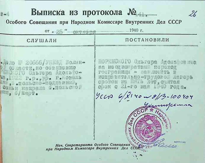 W lipcu sprawa została skierowana do Kolegium Specjalnego NKWD ZSRR. Jak wynika z wyciągu z protokołu nr 141 z dnia 25 października 1940 r., Olgierd Porębski został umieszczony w poprawczym obozie pracy na okres pięciu lat, licząc od 21 maja 1940 r.