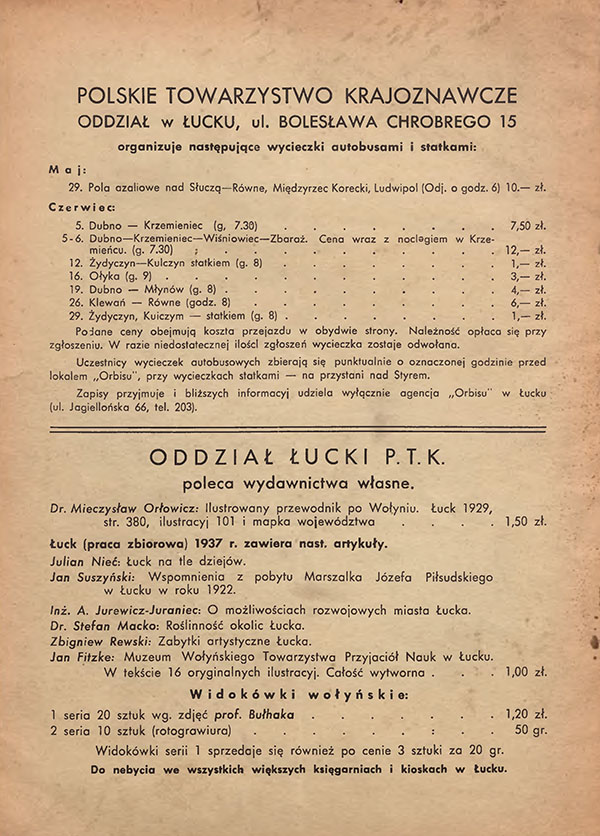 W maju Towarzystwo zorganizowało w Łucku odczyt Małuszyńskiego o mieście, a także zainaugurowało sezon turystyczny drukiem planu wycieczek na czerwiec. Według niego rejs statkiem z Łucka do Żydyczyna i Kulczyna kosztował 1 zł i trwał 8 godzin (tyle kosztował przejazd w obie strony). Pozostałe wycieczki były autobusowe. Najtańsza była wycieczka do Ołyki (3 złote, 9 godzin) oraz Dubna i Młynowa (4 złote, 8 godzin). Najdroższa wycieczka do Dubna, Krzemieńca, Wiśniowca i Zbaraża z noclegiem w Krzemieńcu kosztowała 12 złotych.