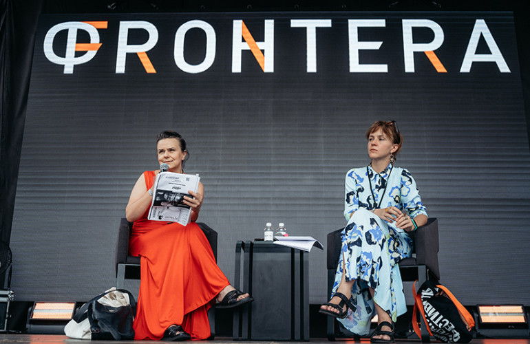 Rozmowa o wierszach na scenie «Frontery». Julia Fiedorczuk i Ija Kiwa. Fot. Mykoła Cymbaluk