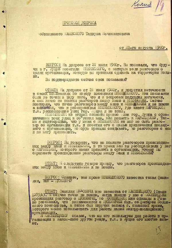 W aktach sprawy znajduje się również kopia protokołu przesłuchania aresztowanego przez NKWD Tadeusza Majewskiego, który datowany jest 23 sierpnia 1940 r. Majewski także przyjechał z Warszawy, aby rozwijać ośrodki Związku Walki Zbrojnej na Wołyniu. Zeznał, że nigdy nie widział Cichowicza, ale potwierdził, że wiedział o nim od Kasprzyckiego. Oświadczył także: «Planowaliśmy wysłać Cichowicza do Włodzimierza Wołyńskiego jako jednego z kierowników, ale powiedziałem Burdzie (Kasprzyckiemu), żeby wysłał Cichowicza do mnie, do Równego, abym mógł poznać go osobiście i, gdyby okazało się, że nadaje się do pracy organizacyjnej, wysłać go do Włodzimierza Wołyńskiego». Cichowicz jednak, jak zaznaczył Majewski, nigdy nie dotarł do Równego.