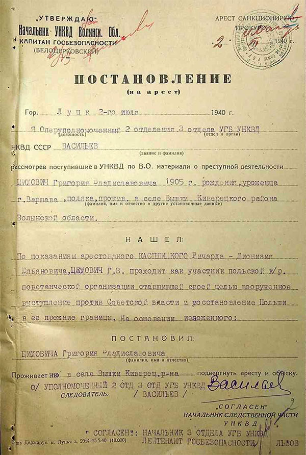 Pracownik urzędu wojewódzkiego w Łucku Grzegorz Cichowicz został aresztowany przez funkcjonariuszy NKWD 2 lipca 1940 r. Oskarżono go o udział w organizacji kontrrewolucyjnej.
