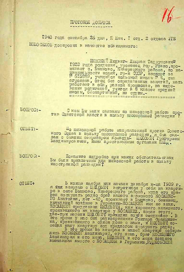 Przesłuchanie w dniu aresztowania przeprowadził naczelnik 1. Wydziału 2. Oddziału Zarządu Bezpieczeństwa Państwowego, młodszy lejtnant Nowosiołow. Pierwsze pytanie brzmiało: «Z kim był Pan powiązany w działalności szpiegowskiej przeciwko władzom radzieckim na rzecz zagranicznego wywiadu?» Na to Ludwik Lucjan Piński odpowiedział, że był powiązany z sekretarzem wojewody Grzegorzem Cichowiczem (w pierwszej części protokołu jego nazwisko zapisywano jako «Ciechowicz»). Jak odnotowano w protokole, wydarzyło się to w następujący sposób: po zajęciu Wołynia przez sowietów kilku miejscowych Polaków regularnie przychodziło do rodziców Pińskiego, aby słuchać audycji radiowych w języku polskim nadawanych z Londynu. Wśród nich był Cichowicz. Podobno powiedział, że każdy Polak powinien pomagać Anglii, «prowadząc walkę z władzą sowiecką w każdej formie, która tylko będzie możliwa».
