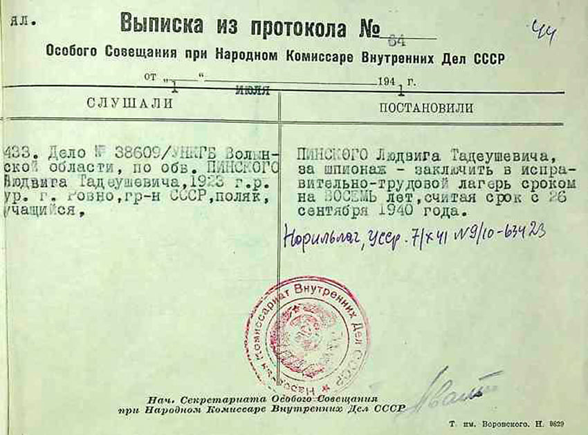 Zgodnie z wyciągiem z protokołu nr 64 z dnia 1 czerwca 1941 r. Ludwika Lucjana Pińskiego umieszczono w poprawczym obozie pracy na okres ośmiu lat, licząc od dnia 26 września 1940 r.