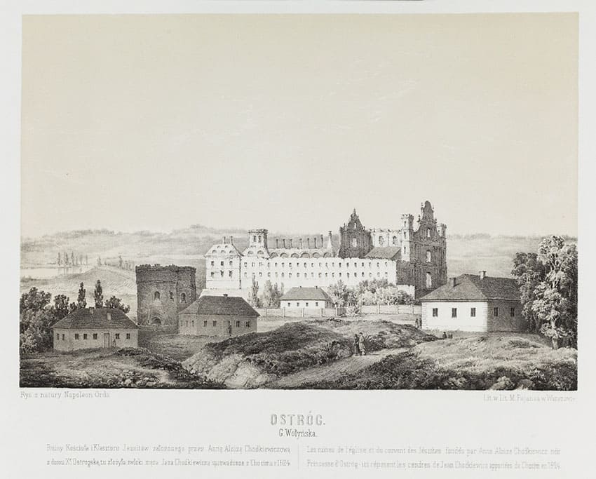 Ruiny kolegium jezuickiego w Ostrogu. Rysunek Napoleona Ordy. Public domain