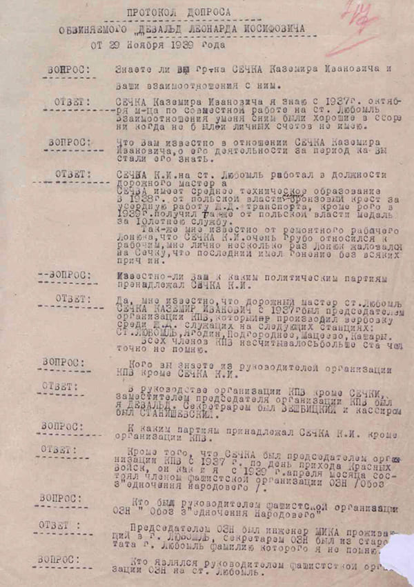 Funkcjonariusze NKWD wszczęli wspólną sprawę karną przeciwko kolejarzom Leonardowi Dewaldowi i Kazimierzowi Sieczce, ponieważ obaj byli członkami partii OZN w Lubomlu. Pomimo faktu, że sprawa była szyta grubymi nićmi, obaj zostali skazani na osiem lat łagrów.