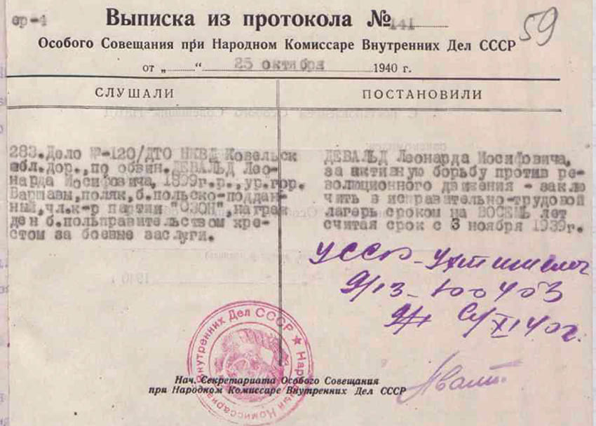 Leonard Dewald został aresztowany 3 listopada 1939 r. przez funkcjonariusza NKWD Kolei Kowelskiej, oficera operacyjnego o nazwisku Czornoszczoki.