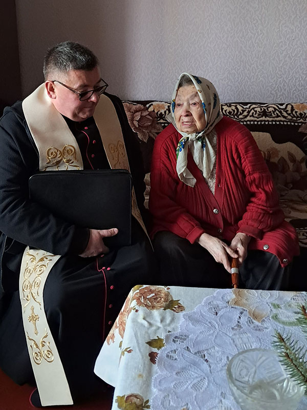 Irena Wierzbicka z proboszczem katolickiej parafii w Dubnie Grzegorzem Oważanym. 2023 r.