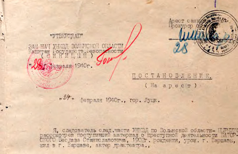 Nakaz aresztowania Wiesława Batorskiego został podpisany przez śledczego NKWD Pyrnikowa 24 lutego 1940 r., a przez zastępcę naczelnika Zarządu NKWD w Obwodzie Wołyńskim, kapitana bezpieczeństwa państwowego Sinicyna, 28 lutego 1940 r. To zwykła formalność, w której nie ma nic niezwykłego, ale… W tym konkretnym przypadku istnieją co najmniej dwa punkty, które w państwie prawa rodziłyby wiele pytań. Po pierwsze: w chwili podpisywania dokumentu Batorski już od pięciu (!) miesięcy przebywał w więzieniu. Po drugie: brak popełnienia przestępstwa.