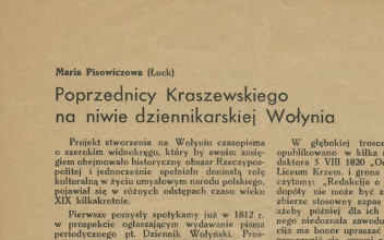 Proponujemy Państwu ciąg dalszy artykułu Marii Pisowicz pt. «Poprzednicy Kraszewskiego na niwie dziennikarskiej Wołynia» z nr. 5 «Ziemi Wołyńskiej» z 1939 r.